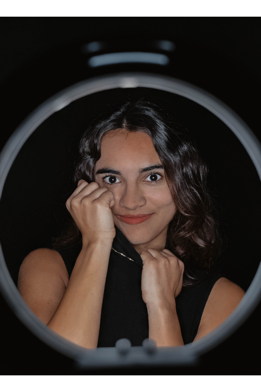 7. Ring Light / On-Camera LED – Produces an even, shadow-free look by placing the light source directly around or above the lens. Creates a modern, polished aesthetic, often with a signature catchlight in the eyes, making it popular for influencers and content creators.