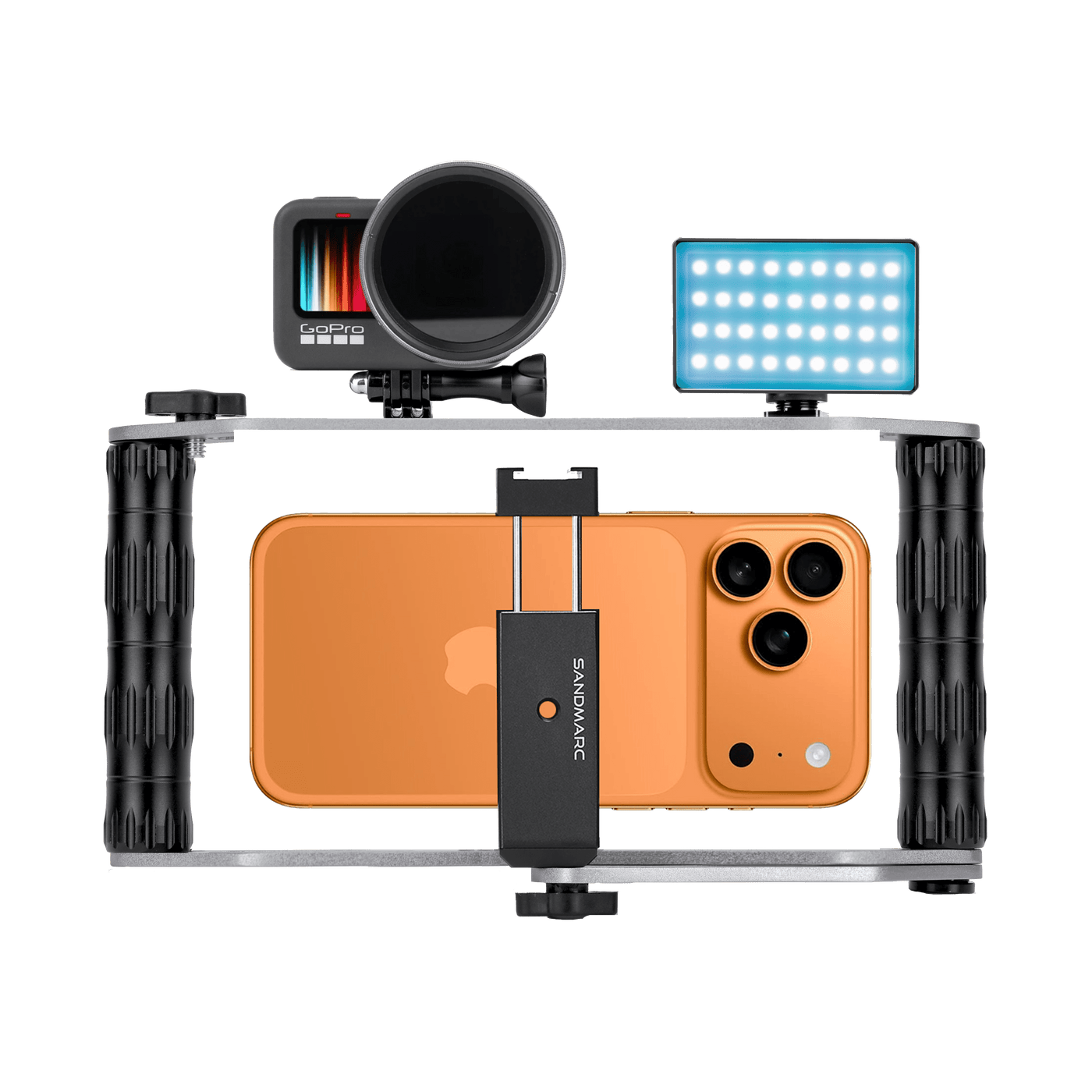The Film Rig offers unmatched versatility, allowing you to mount your iPhone, GoPro, and most other smartphones. It also supports accessories like microphones, audio interfaces, tripods, and a range of lighting options. With these configuration possibilities, you have the freedom to customize your setup and elevate your content creation.